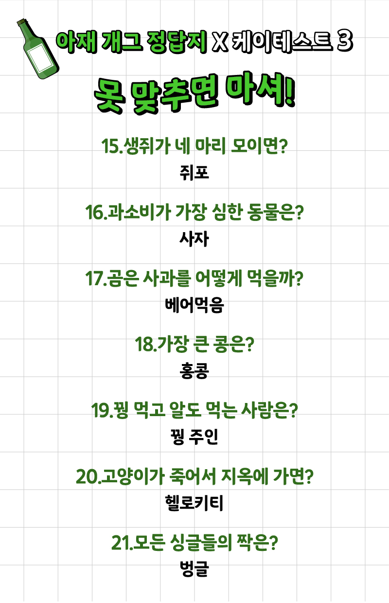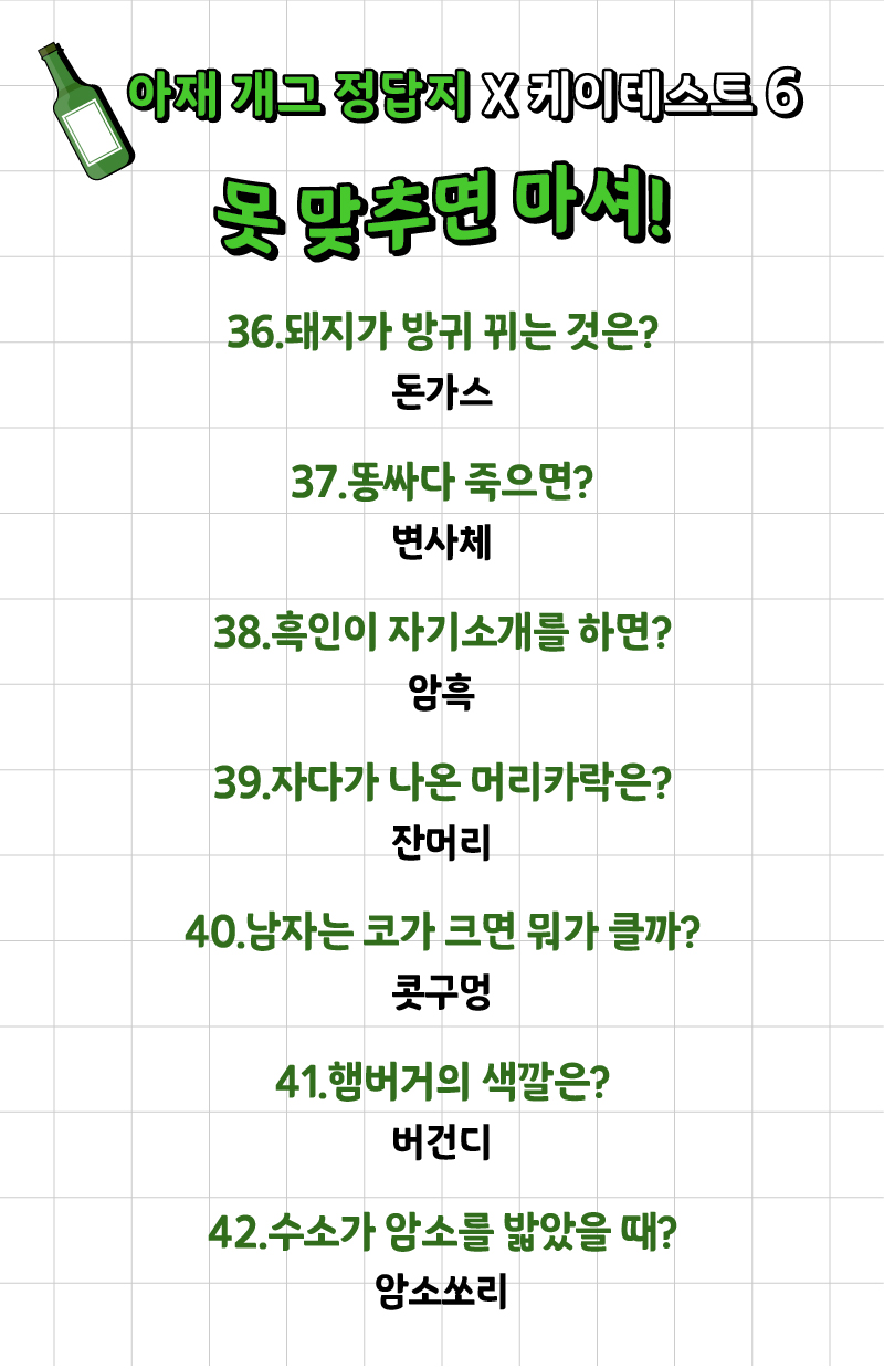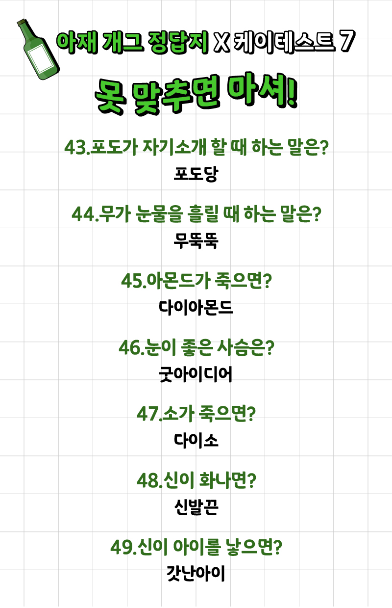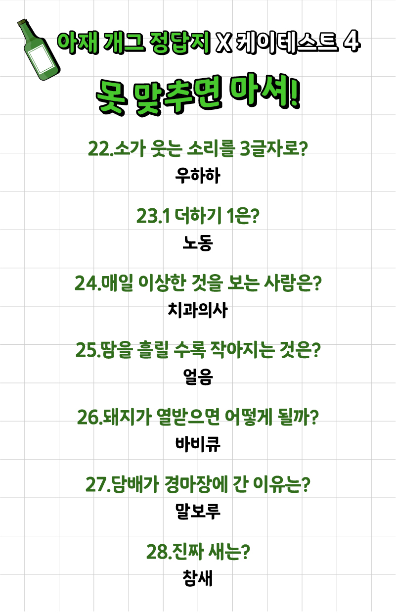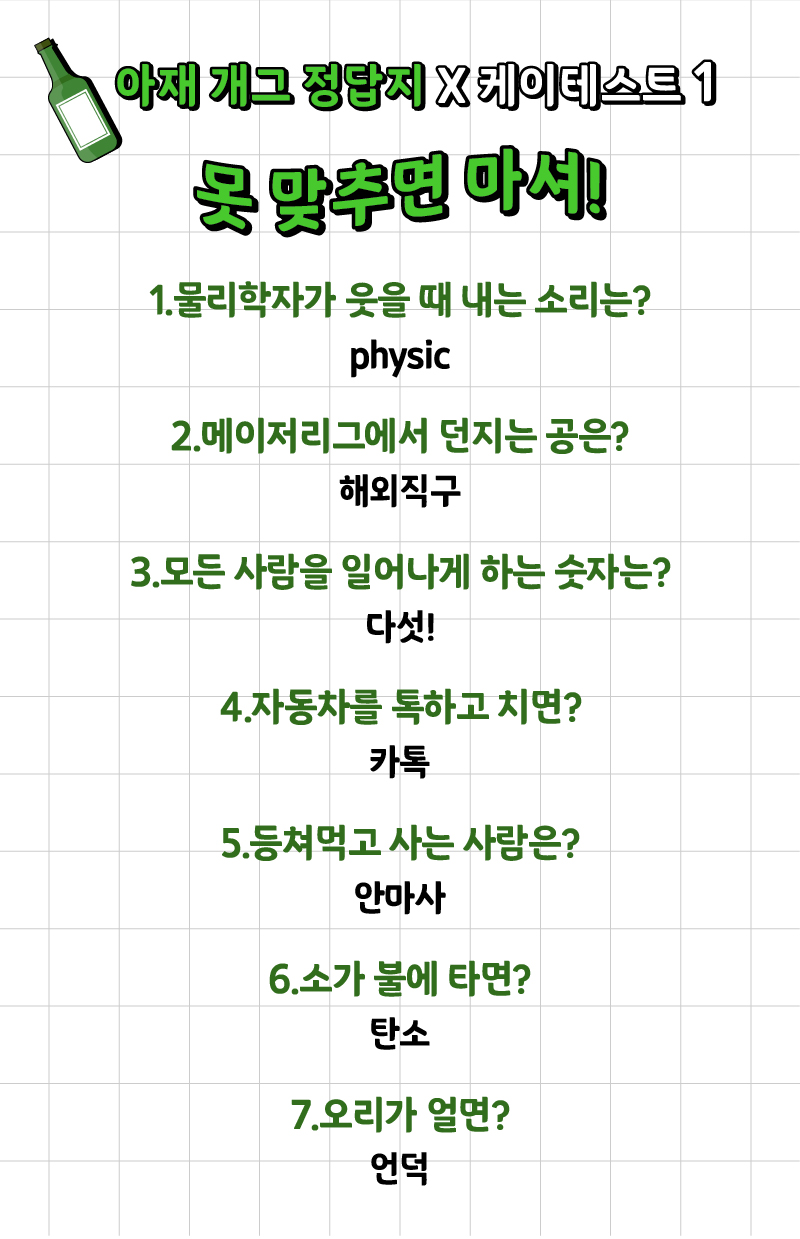 나는 얼마나 많은 아재 개그를 알고 있고 또 맞출 수 있는지 ‘아재 개그 맞추기 게임’이 케이테스트라는 사이트에 나왔는데 여러분들께 소개드리겠습니다.