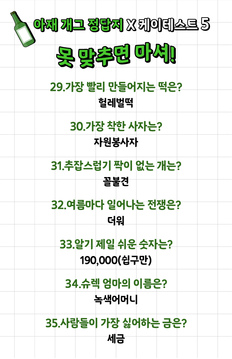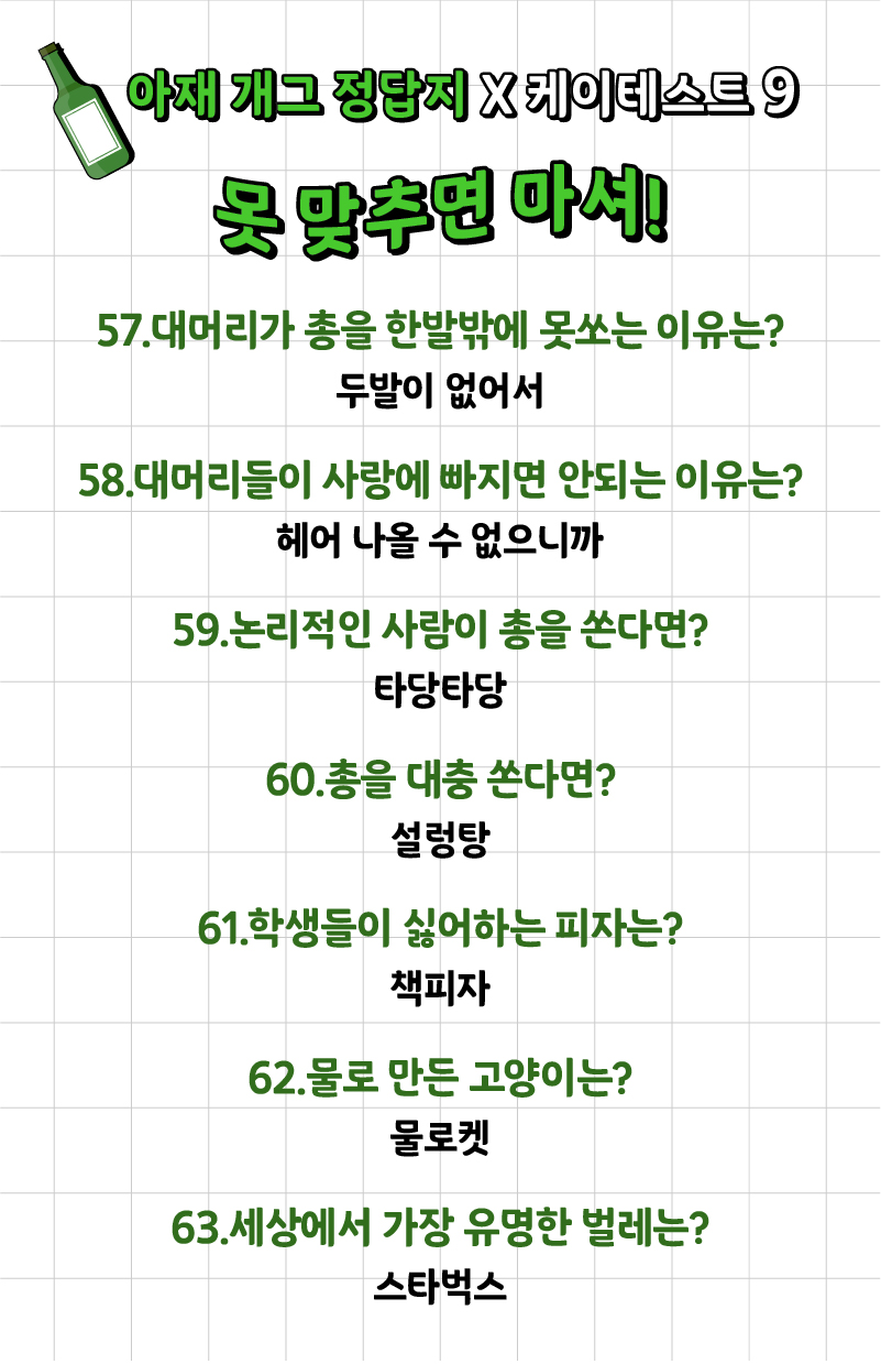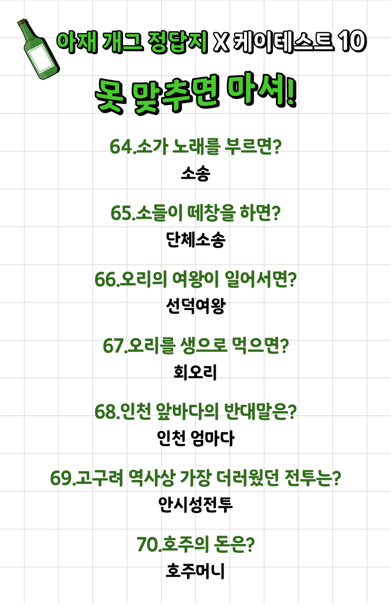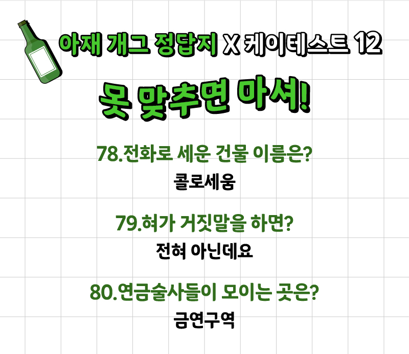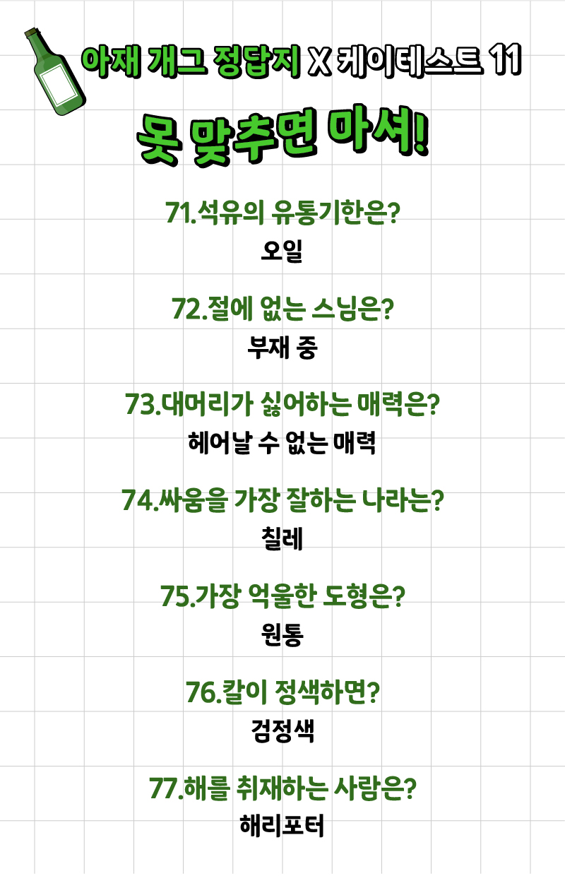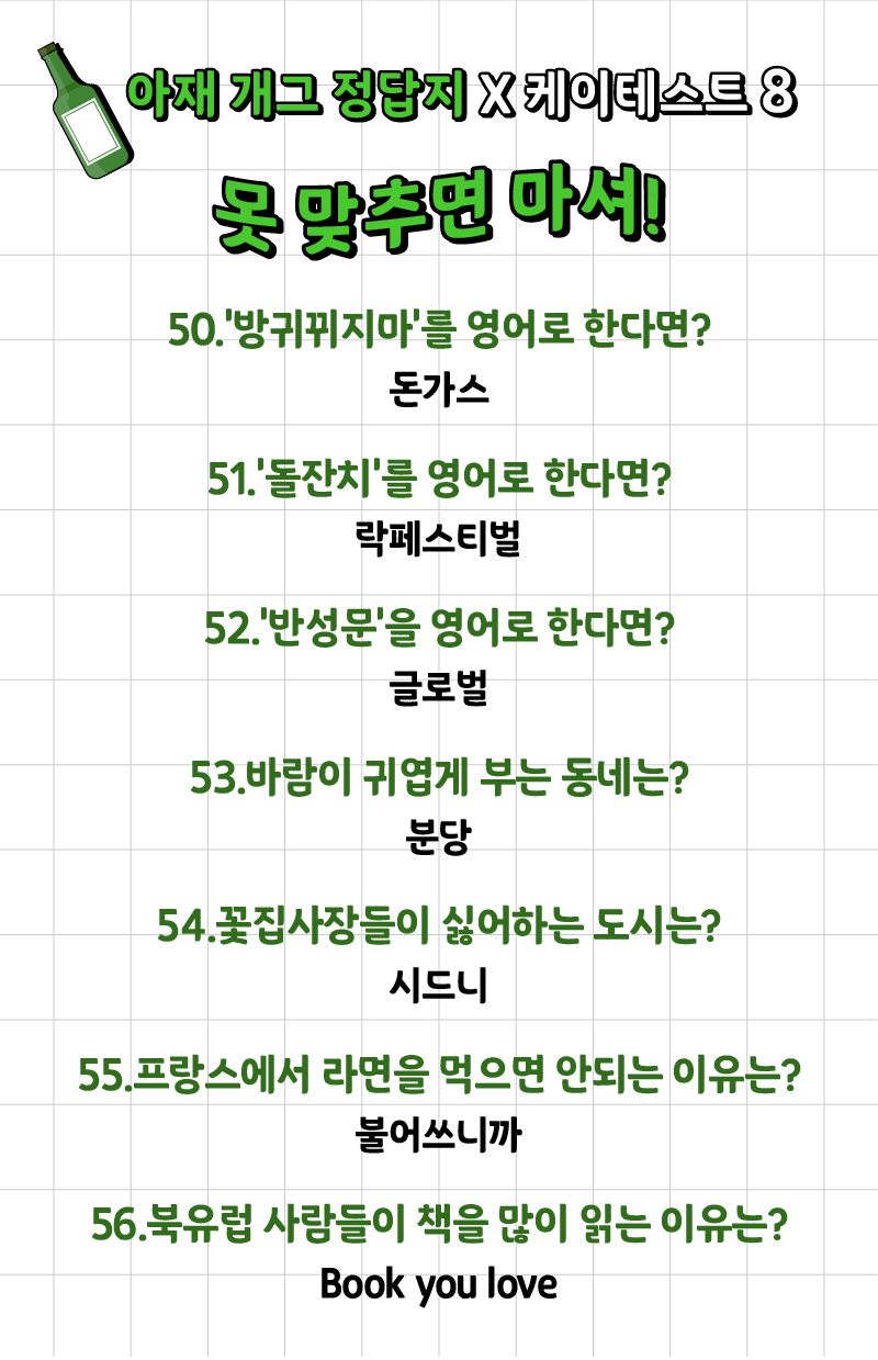 나는 얼마나 많은 아재 개그를 알고 있고 또 맞출 수 있는지 ‘아재 개그 맞추기 게임’이 케이테스트라는 사이트에 나왔는데 여러분들께 소개드리겠습니다.
