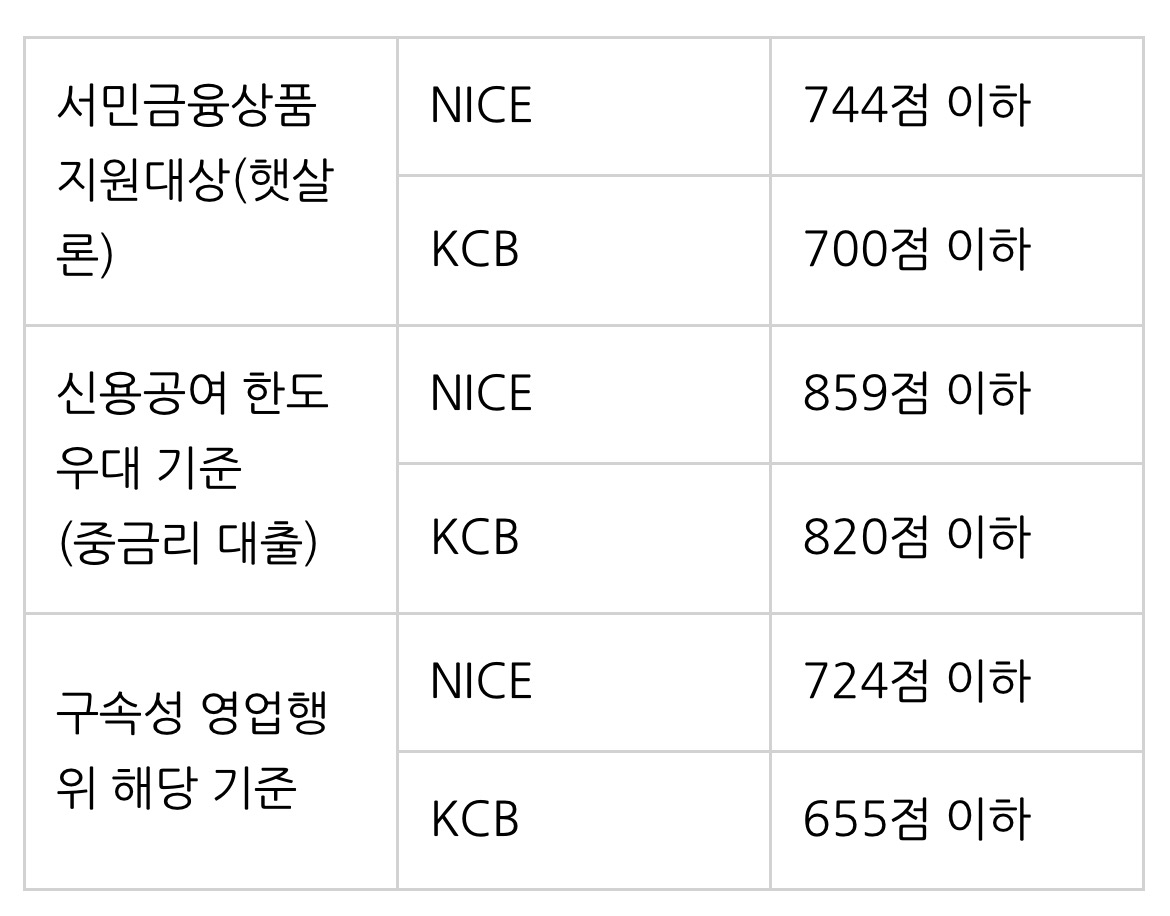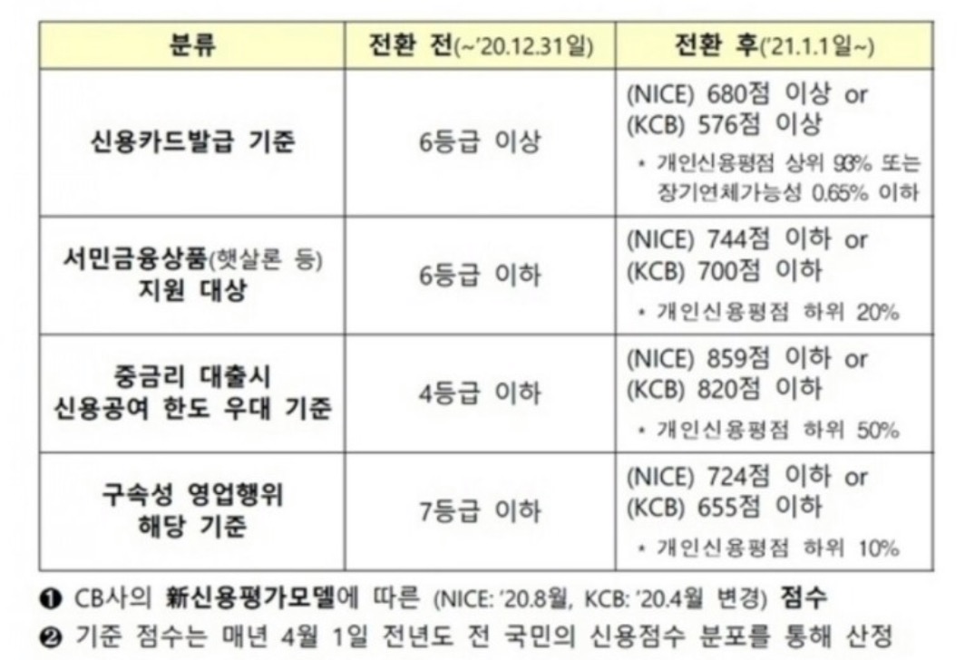 2021년부터는 금융위원회에서 제시하는 자료와 같이 기준 점수가 1점 단위로 세분화되었으니 아래 항목에 해당하시는 분들은 자신의 점수와 비교하여 검토하시길 바랍니다.