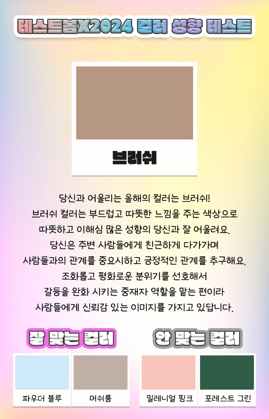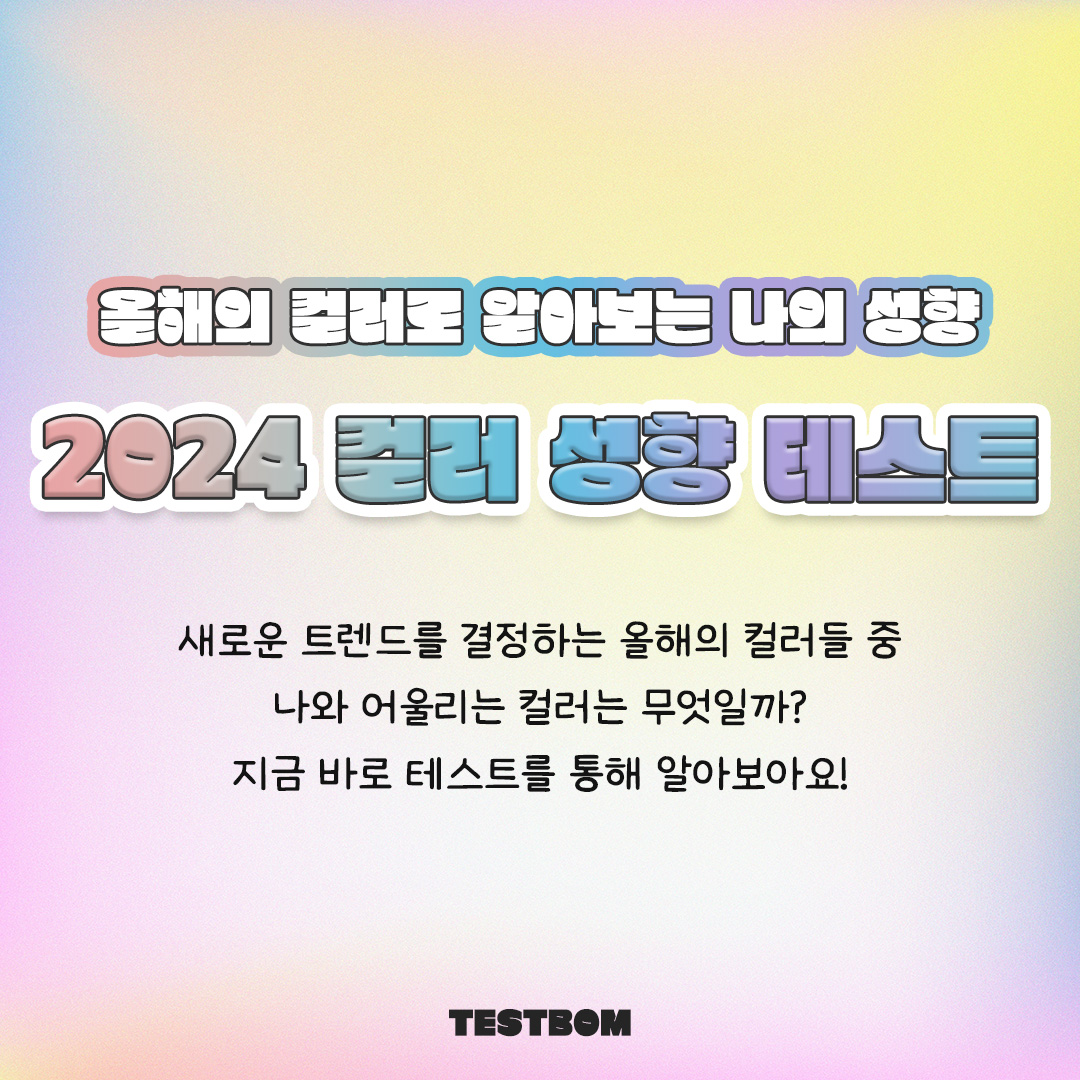 새로운 트렌드를 결정하는 올해의 컬러들 중 나와 어울리는 컬러는 무엇일지 지금 바로 테스트를 통해 알아볼 수 있는 테스트봄에서 나온 ‘2024 컬러 성향 테스트’를 소개드리겠습니다.