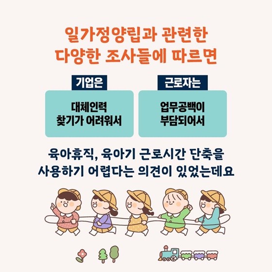 2022년 일가정양립실태조사 등에 따르면 근로자는 ‘업무공백 부담, 동료눈치(25.6%)’ 때문에, 기업은 ‘대체인력을 찾기 어려워(22.7%)’ 육아휴직 및 육아기 근로시간단축 제도를 사용하지 못하는 것으로 나타났는데 2024년 고용노동부는 근로자가 출산휴가나 육아휴직 사용 시 기업에 무료로 대체인력을 알선해 주는 대체인력뱅크를 ‘인재채움뱅크’로 명칭을 바꾸고 운영기관을 2023년 3개소에서 2024년 5개소로 확대하여 전국을 5개 권역으로 나누어 서비스를 제공한다고 합니다.
