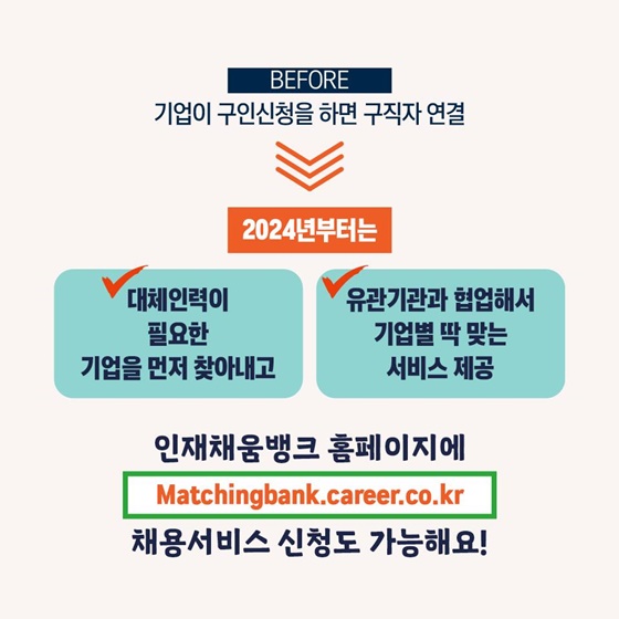 종전에는 기업이 대체인력 구인신청을 하면 구직자를 찾아 연결해 주는 방식이었으나, 2024년 올해부터는 건강보험 및 고용보험 자료를 활용하여 선제적으로 임신․출산 근로자가 있는 기업을 발굴하여 적극적으로 대체인력 지원서비스를 제공하고자한다고 합니다.
