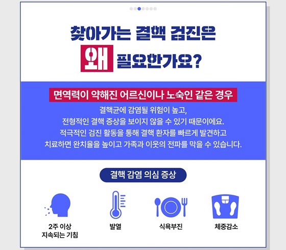적극적인 검진 활동을 통해 결핵 환자를 빠르게 발견하고 치료하면 완치율을 높이고 가족과 이웃의 전파를 막을 수 있다고 합니다.