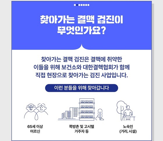 찾아가는 결핵 검진은 결핵에 취약한 이들을 위해 보건소와 대한결핵협회가 함께 직접 현장으로 찾아가는 검진 사업입니다.