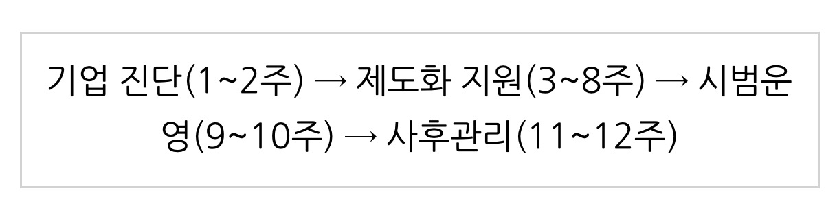 기업 진단(1~2주) → 제도화 지원(3~8주) → 시범운영(9~10주) → 사후관리(11~12주)
