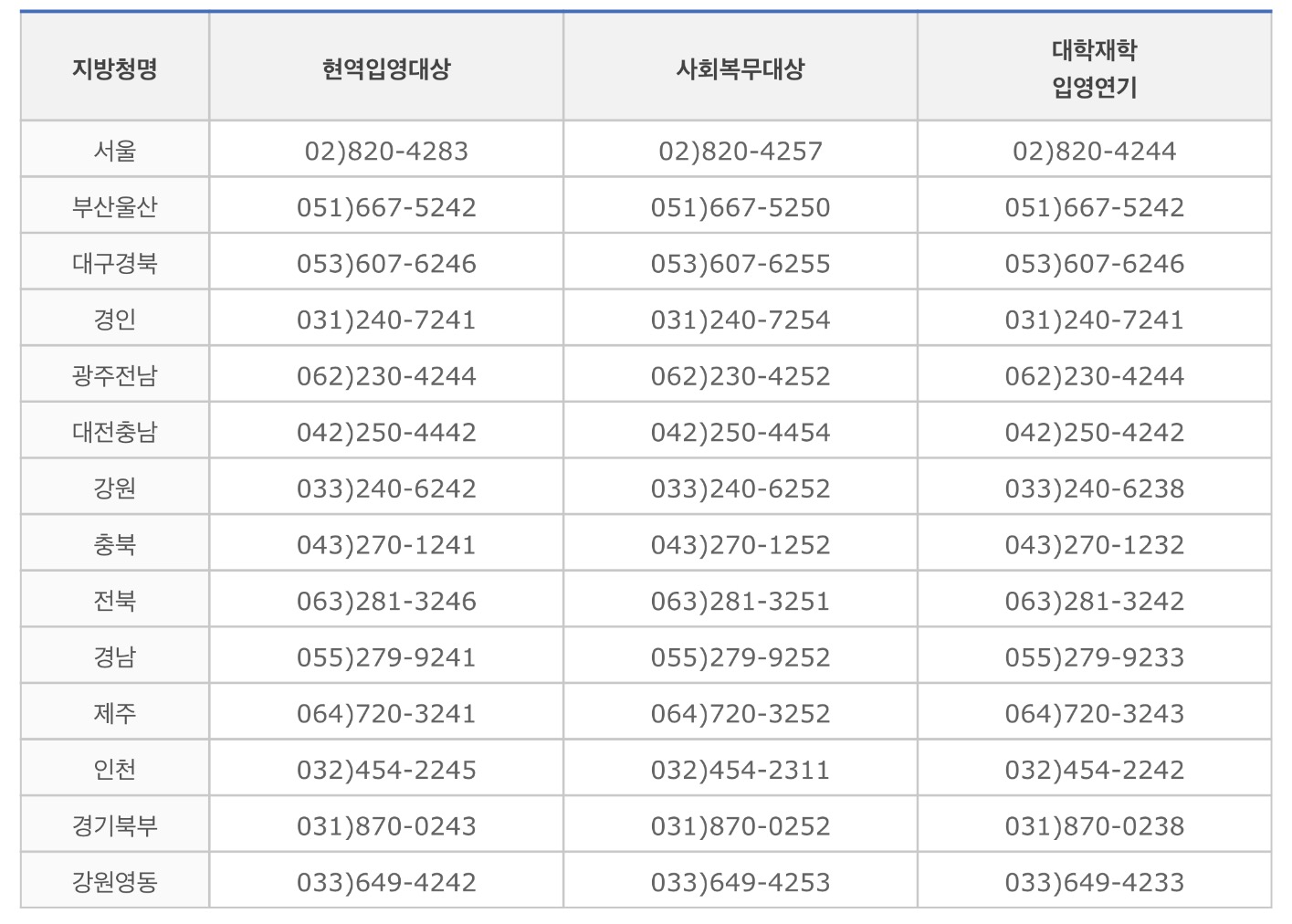 ➡️병적지 관할 지방병무청 전화번호