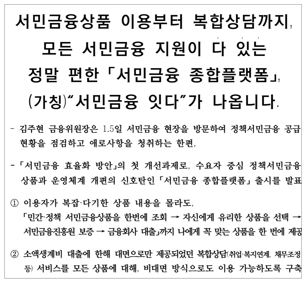 서민금융상품의 이름이나 다양한 지원조건을 몰라도, 자신에게 꼭 맞는 서민금융상품을 찾고 이용할 수 있는 [서민금융 종합플랫폼, 서민금융 잇다(가칭)]를 운영한다고 합니다.