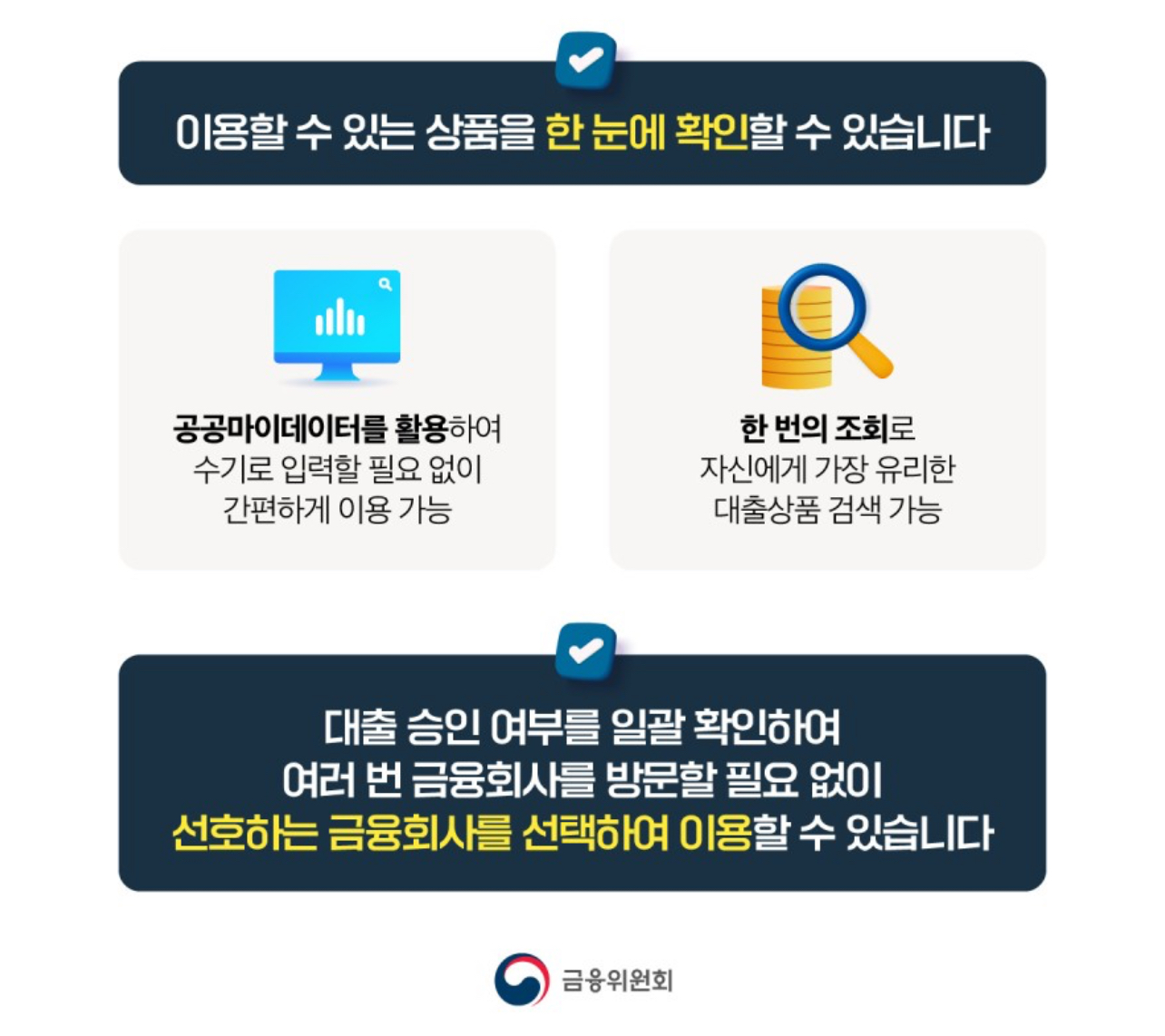 대출 승인 여부를 일괄 확인하여 여러 번 금융회사를 방문할 필요 없이 선호하는 금융 회사를 선택하여 이용할 수 있습니다.