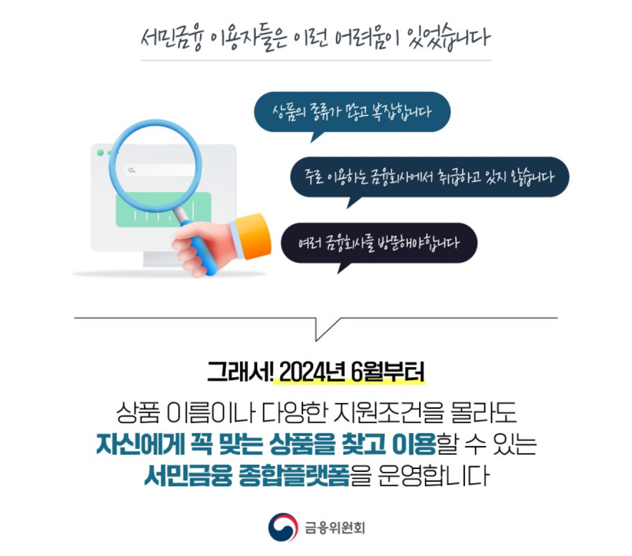 그래서 2024년 6월부터 상품 이름이나 다양한 지원조건을 몰라도 자신에게 꼭 맞는 상품을 찾고 이용할 수 있는 서민금융 종합플랫폼을 운영한다고 합니다.