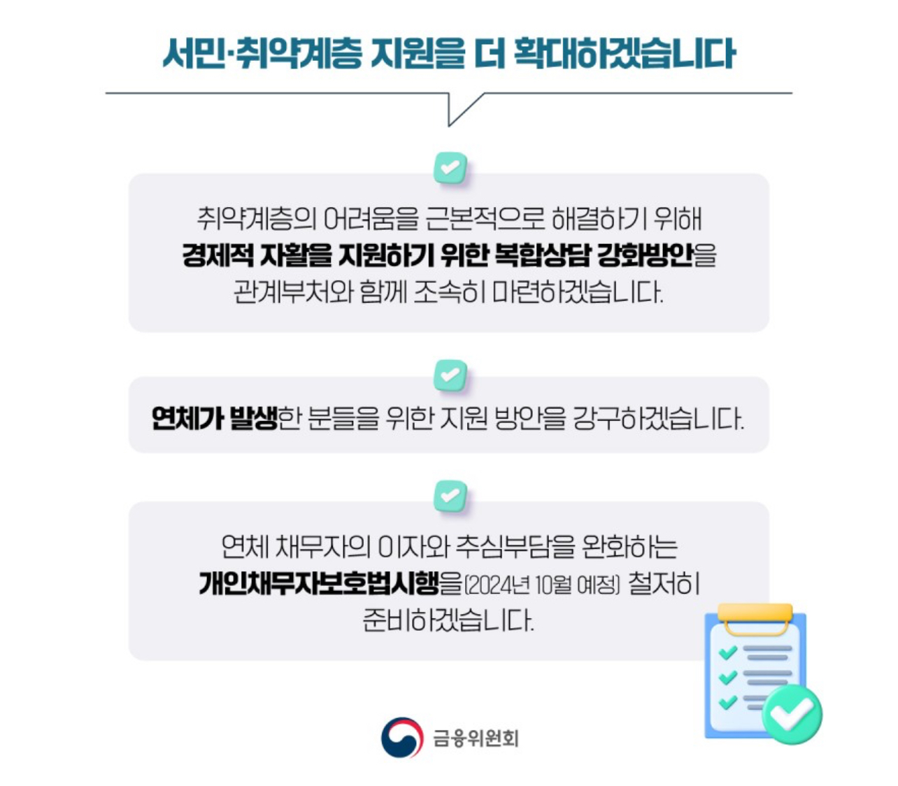 ➡️연체 채무자의 이자와 추심부담을 완화하는 개인채무 자보호법시행을(2024년 10월 예정) 철저히 준비하겠습니다.