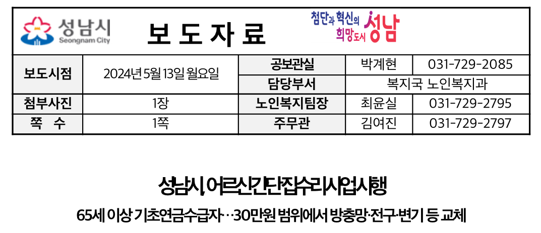 대상자가 따뜻한 동행 주거지원팀(070-7118-2084)이나 성남시 통합돌봄 상담콜센터(031-729-8899)로 오는 2024년 5월 31일까지 전화 신청하면 협력 업체 전문가가 해당 가구를 방문해 간단한 집수리를 해 준디고 합니다.