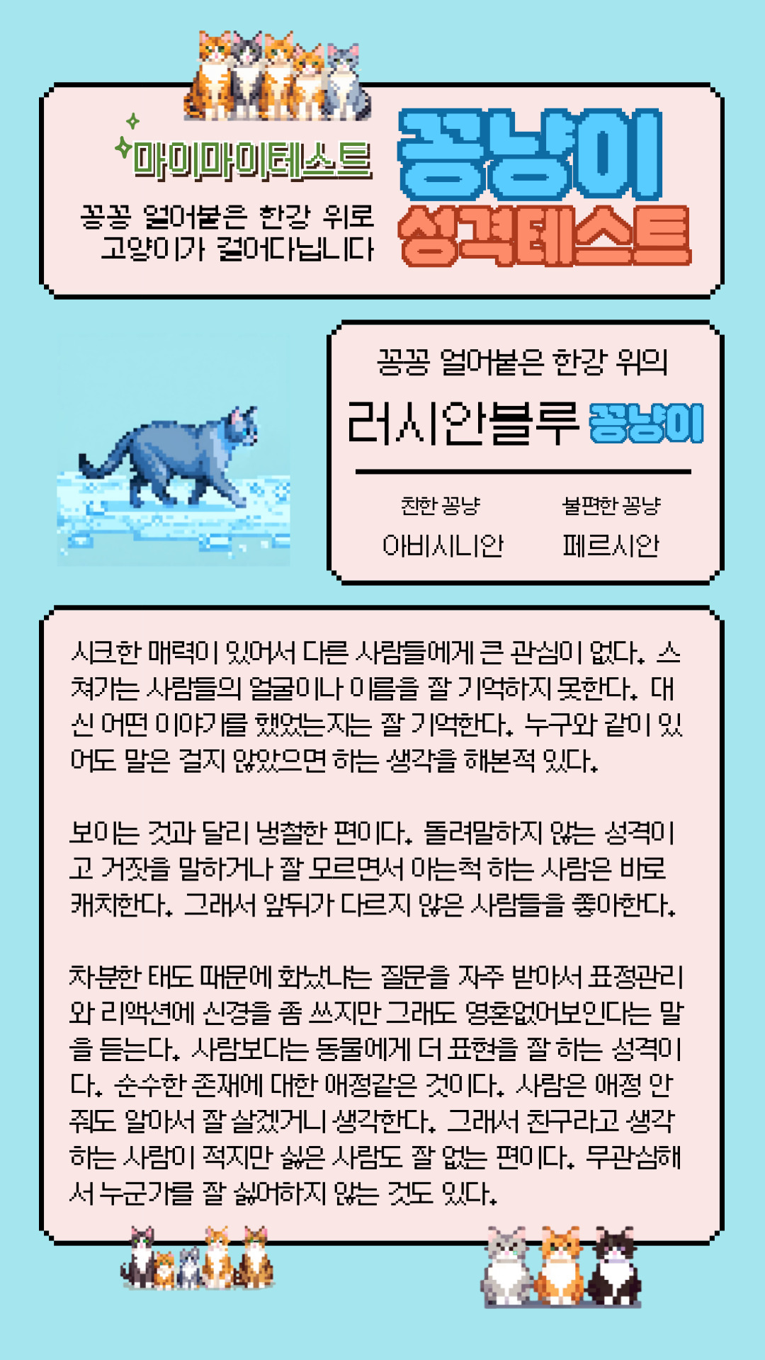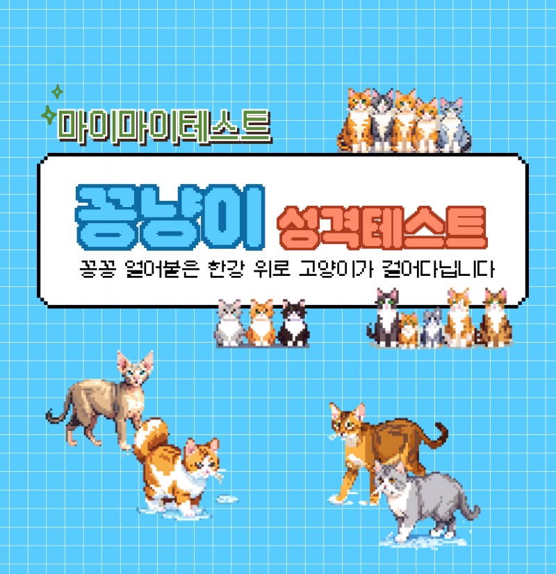 요즘 유튜브, 틱톡, 인스타 등에서 ‘꽁꽁 얼어붙은 한강 위로 고양이가 걸어다닙니다’라는 영상이 매우 화제인데 이와 관련된 테스트가 마이마이테스트라는 사이트에 나와서 여러분들께 소개드리겠습니다.