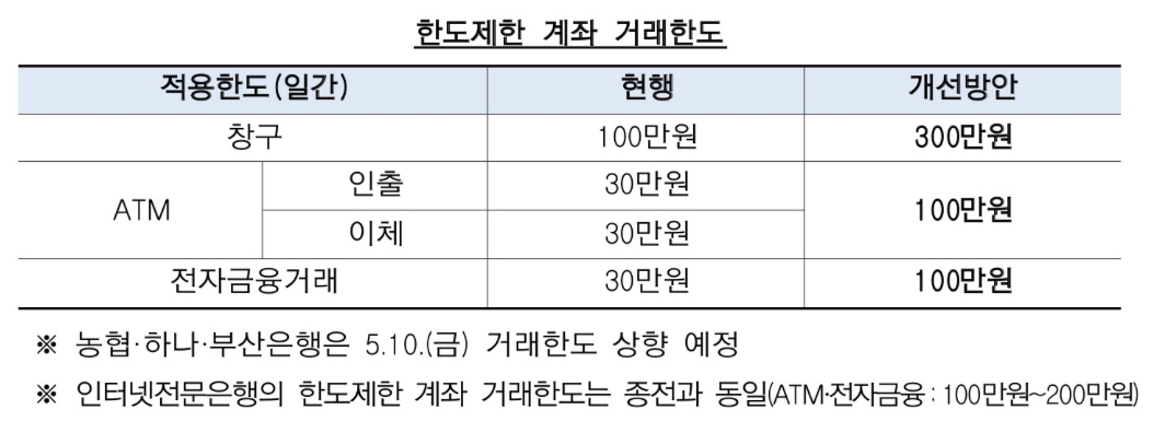 ※인터넷전문은행의 한도제한 계좌 거래한도는 종전과 동일(ATM‧전자금융:100만원~200만원)