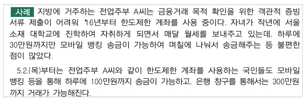 그동안 국민들이 입출금 통장 개설 또는 한도제한 계좌의 한도 해제 시 금융거래 목적 확인을 위한 실물 서류를 직접 갖추어 제출함에 따라 필요 서류 중 일부를 누락했을 때에는 관공서‧은행 창구를 여러 번 방문해야 하는 등 번거로움이 있었습니다.
