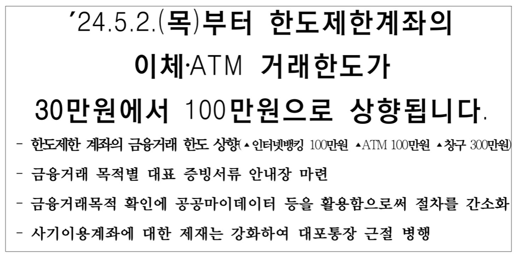 이는 한도제한 계좌 제도가 완화되는 만큼, 그에 비례하여 보이스피싱 피해 방지대책을 강화하기 위한 방안입니다.