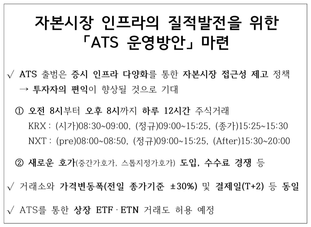 ATS 출범에 따라, 증시 투자자들은 새로운 증권거래 서비스를 경험하게 될 것으로 기대된다고 합니다.