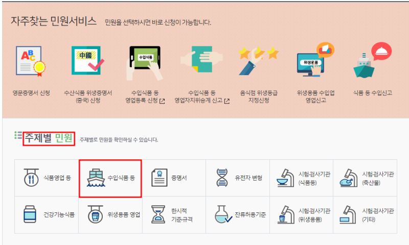 3. 주제별 민원 '수입식품 등' 클릭