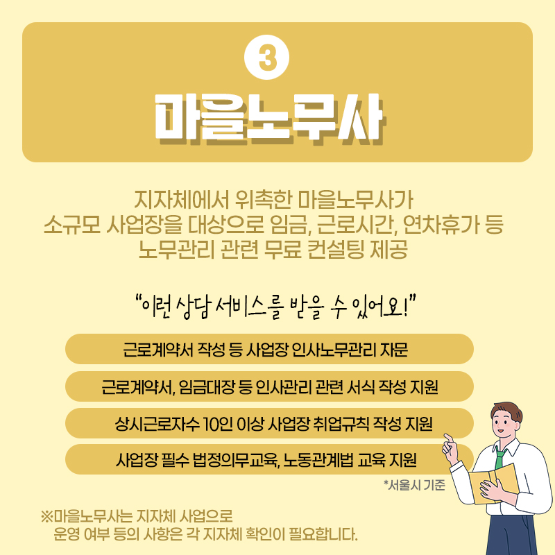 지자체에서 위촉한 마을노무사가 소규모 사업장을 대상으로 임금, 근로시간 연차휴가 등 노무관리 관련 무료 컨설팅 제공