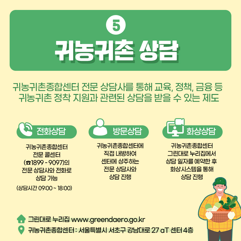 귀농귀촌종합센터 전문 콜센터(☎1899 - 9097)의 전문 상담사와 전화로 상담 가능(상담시간 09:00 ~ 18:00)