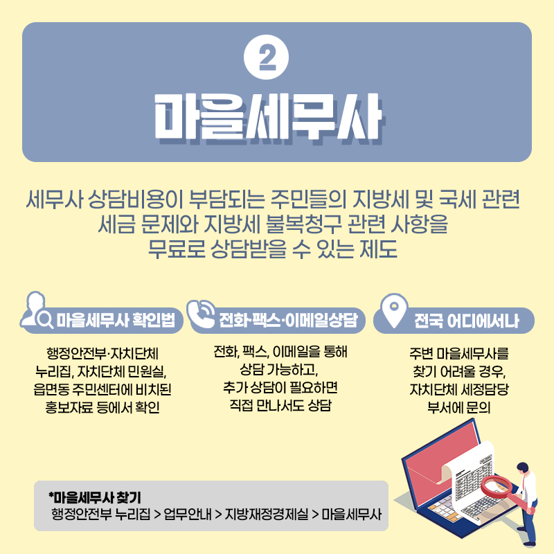 - 주변 마을세무사 찾기 어려울 경우 자치단체 세정담당 부서에 문의