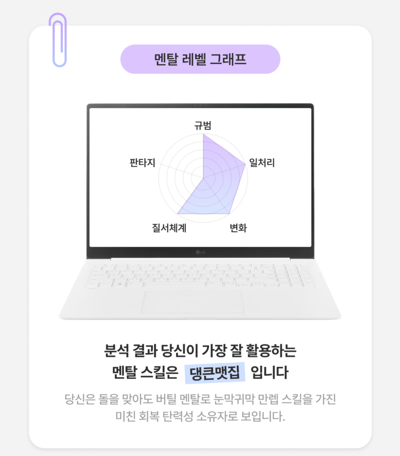 분석 결과 당신이 가장 잘 활용하는 멘탈 스킬은 댕큰맷집 입니다