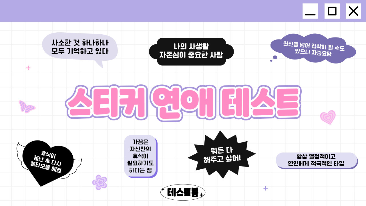 테스트봄이라는 사이트에서 스티커 연애 테스트를 통해 나의 연애 스타일을 알아보는 테스트가 나왔는데 여러분들께 소개드리겠습니다.
