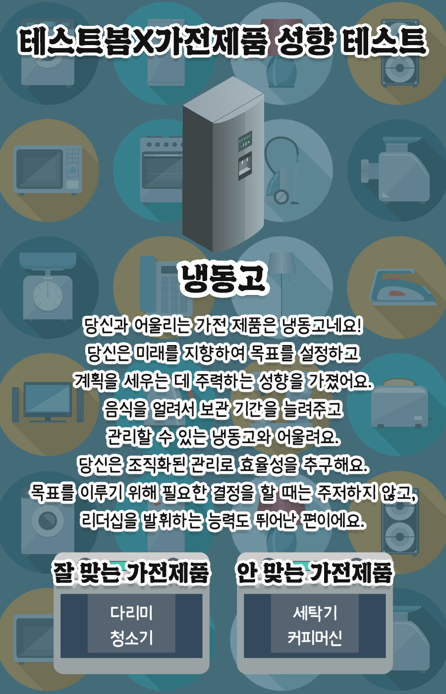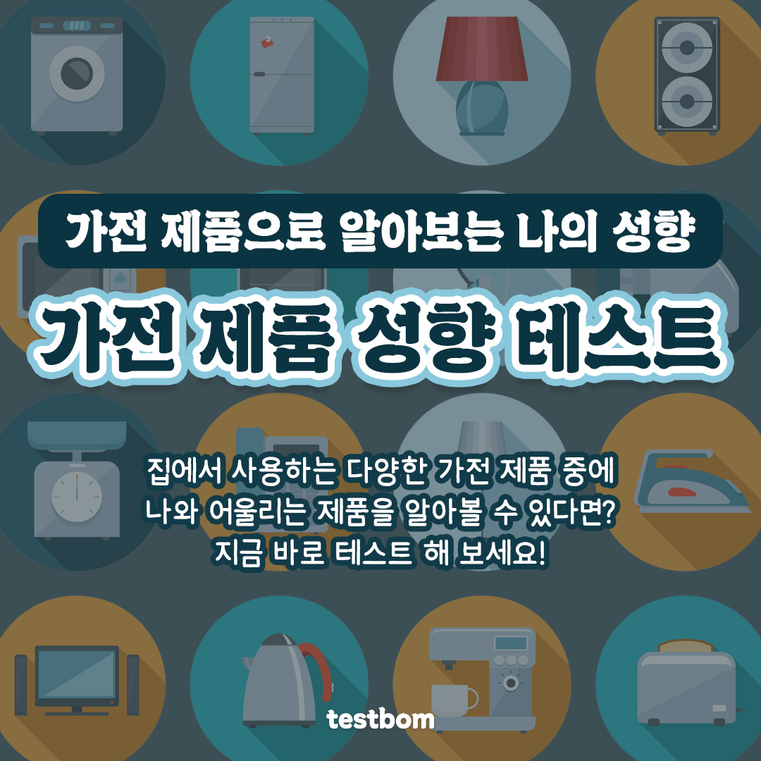 집에서 사용하는 다양한 가전 제품 중에 나와 어울리는 제품을 알아볼 수 있다면 무엇일지 알아보는 테스트봄에서 나온 ‘가전제품 성향 테스트’를 소개드리겠습니다.