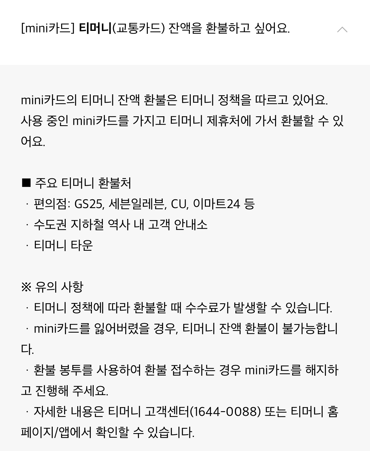 ﹒mini카드를 잃어버렸을 경우, 티머니 잔액 환불이 불가능합니다.