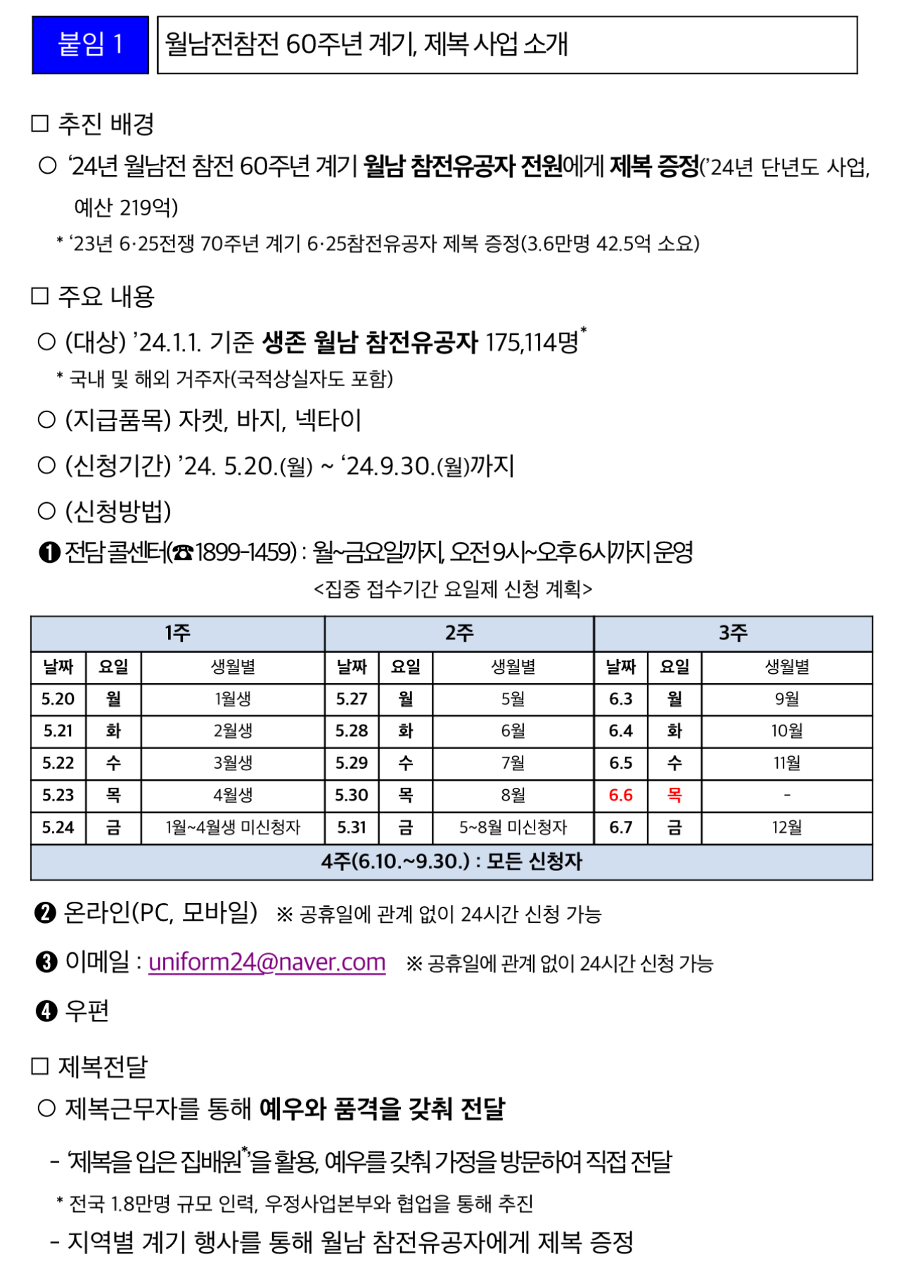 국가보훈부(장관 강정애)는 월남전 참전 60주년을 맞아 올해 2024년 1월 1일 기준 생존 월남 참전유공자 17만 5천여 명 전원에게 새로운 제복을 지급하는 사업에 대한 신청을 오는 2024년 5월 20일부터 9월 말까지 접수한다고 밝혔습니다.