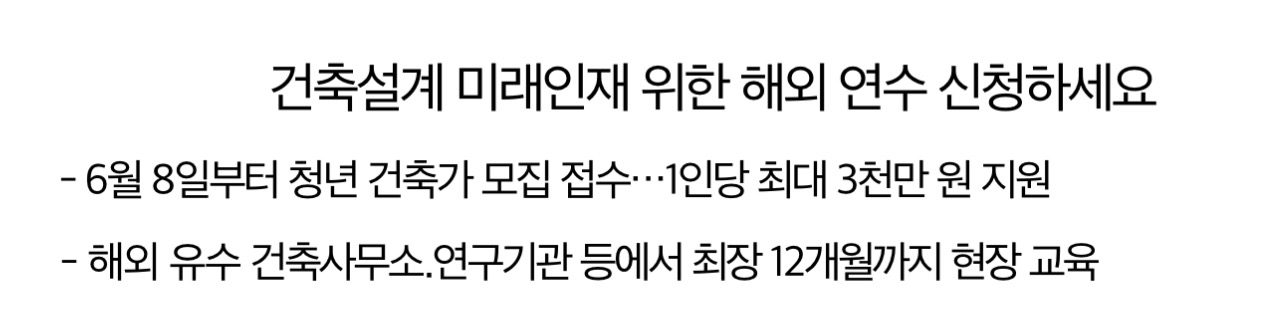 또한, 위의 해외연수 지원과 더불어, 국제 설계공모·프로젝트, 해외전시 등의 건축 관련 활동에 필요한 비용을 지원하여 다양한 훈련을 통한 역량향상도 함께 추진할 예정이라고 합니다.