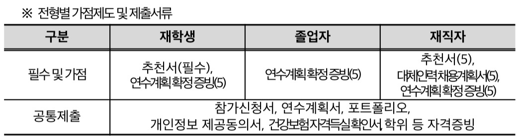 응모 희망자는 본인의 현재 소속에 따라 재학생, 졸업자, 재직자 전형 중 한 가지 전형에 신청할 수 있으며 각 전형에 따라 필수서류 및 가점제도가 다르게 운영되므로, 정확한 서류를 미리 확인하여 준비하는 것이 필요합니다.