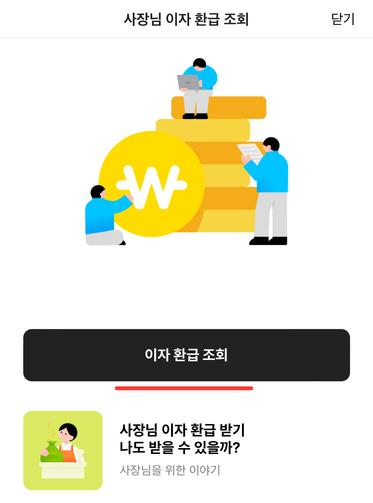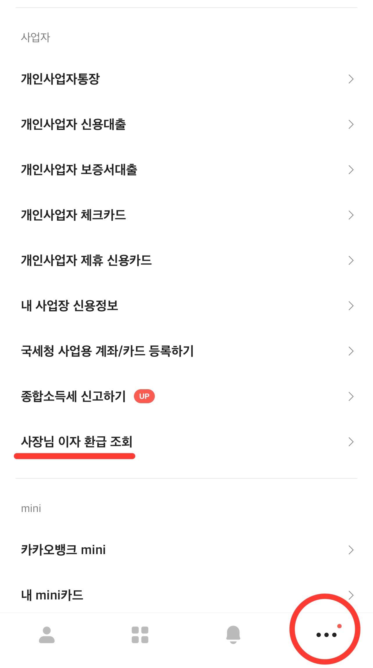 2. 하단에 ...클릭 후 ‘사장님 이자 환급 조회’를 눌러주시면 됩니다.