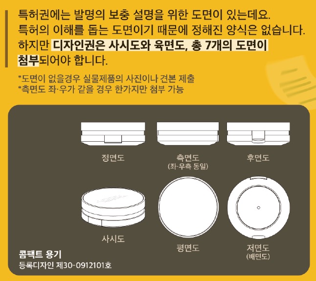 하지만 디자인권은 사시도와 육면도, 총 7개의 도면이 첨부되어야 합니다.