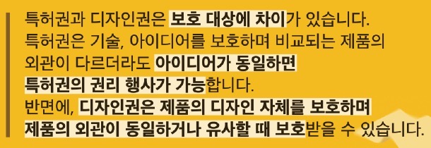 먼저 특허권과 디자인권은 보호 대상에 차이가 있습니다.