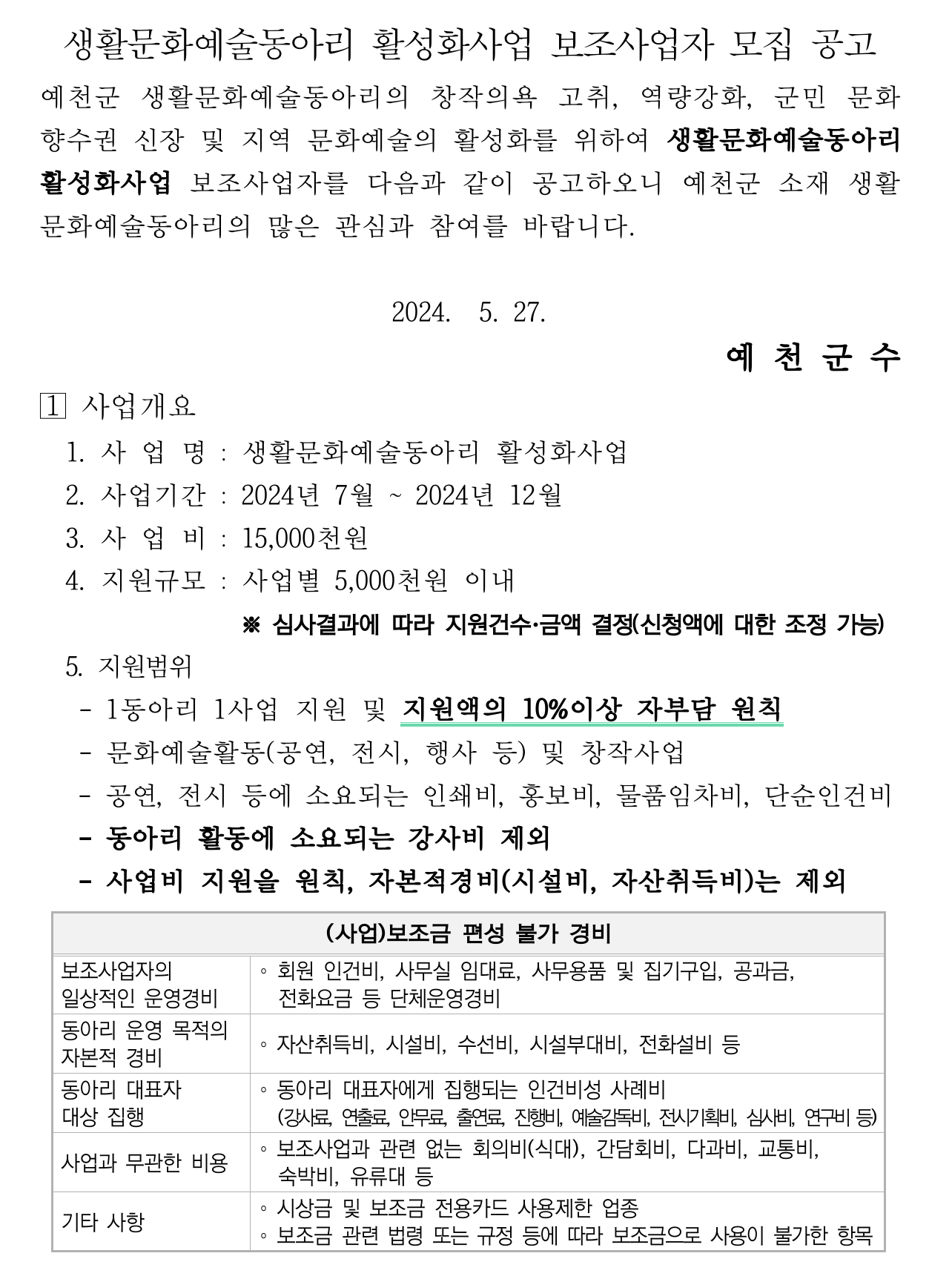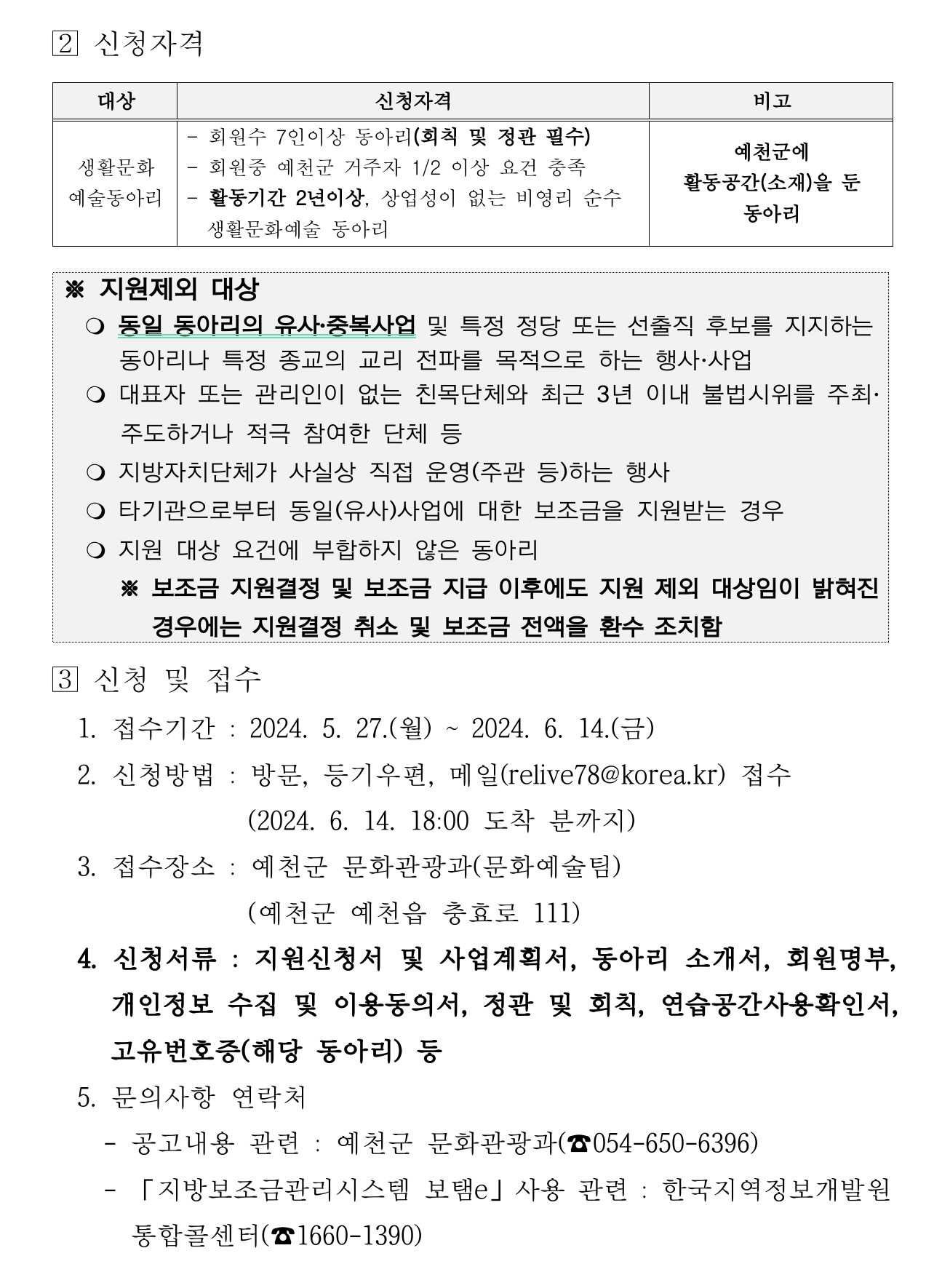 신청 자격은 공고일 기준 예천군에 소재를 두고 문화 예술 활동 등 문화예술진흥을 위한 사업을 목적으로 하는 동아리로 최근 2년간 사업실적이 있는 단체입니다.