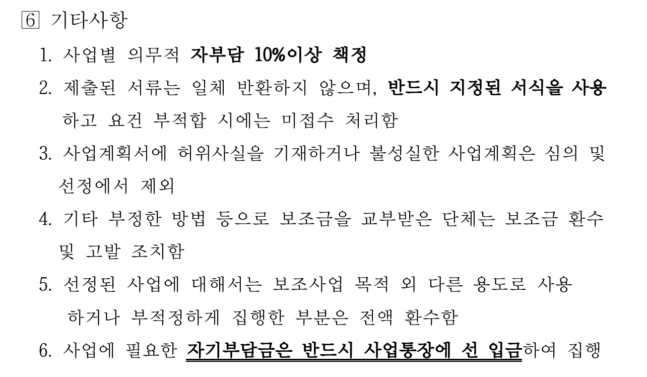 동일 유사 중복사업, 특정 정당 또는 선출직 후보 지지단체, 특정 종교 교리전파를 목적으로 하는 단체 등은 지원 대상에서 제외됩니다.
