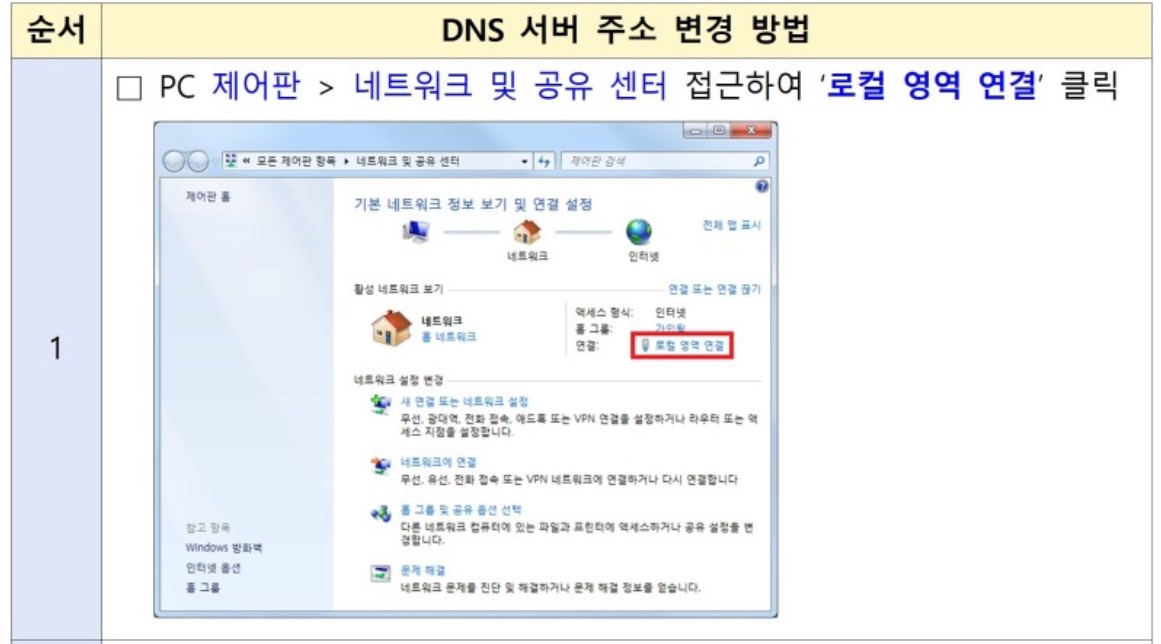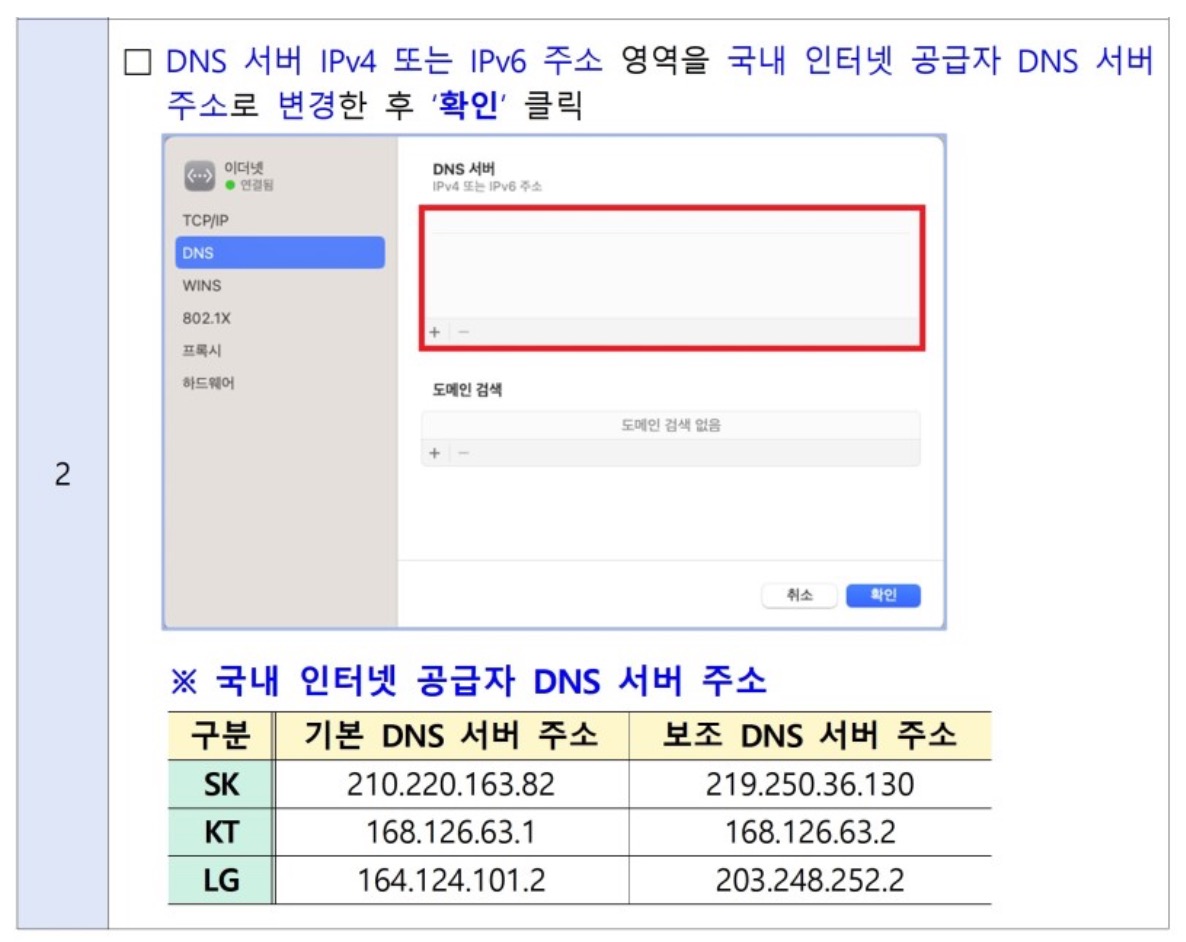 DNS 서버 주소를 국내 인터넷 공급자 DNS 서버 주소로 변경한 후 '확인' 클릭