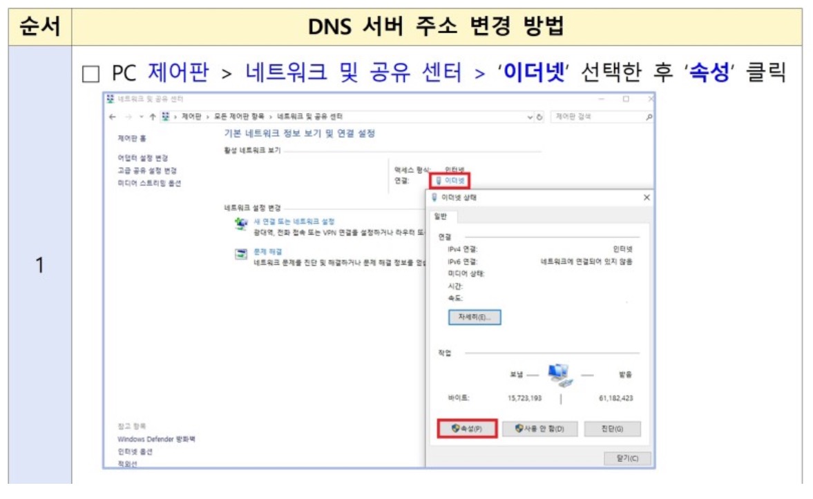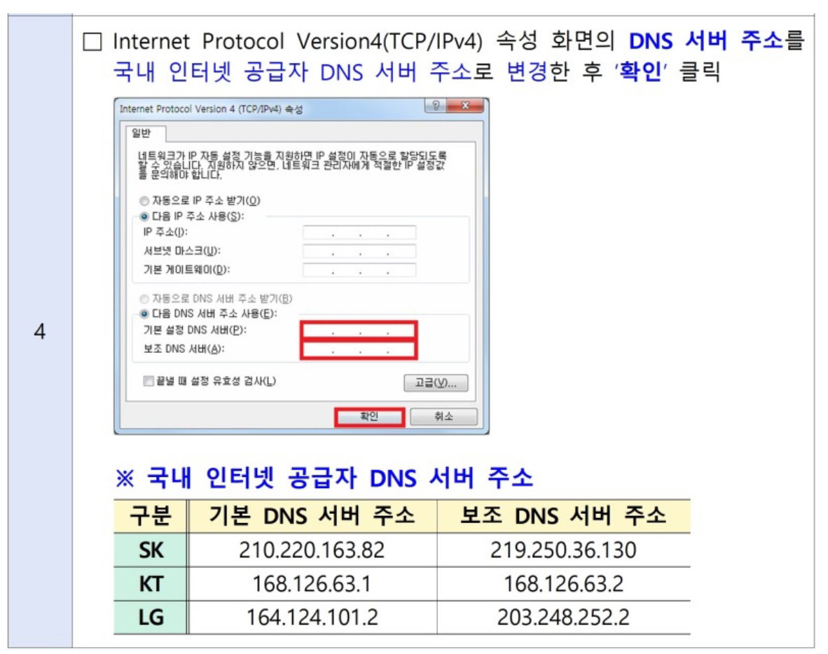 4. Internet Protocol Version4(TCP/IPv4) 속성 화면의 DNS 서버 주소를 국내 인터넷 공급자 DNS 서버 주소로 변경한 후 '확인' 클릭