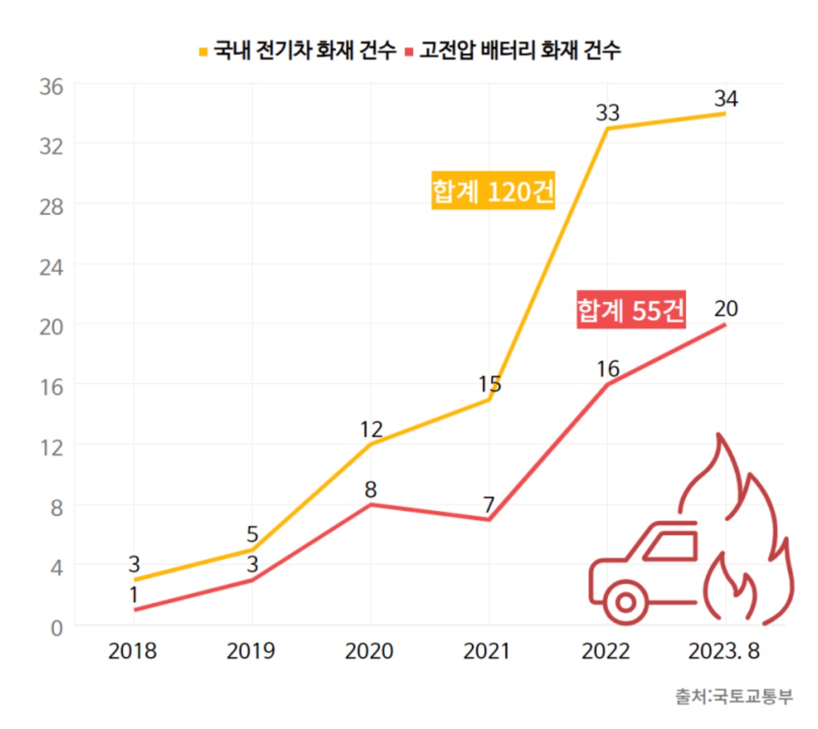최근 몇 년간 전기차 이용자가 늘면서 전기차 화재에 대한 우려도 함께 커지고 있는데 실제 자동차만 대당 화재 발생 비율로 보면 여전히 내연기관 자동차가 높긴 하지만 전기차 증가세가 가파르다는 것을 간과할 수 없습니다.