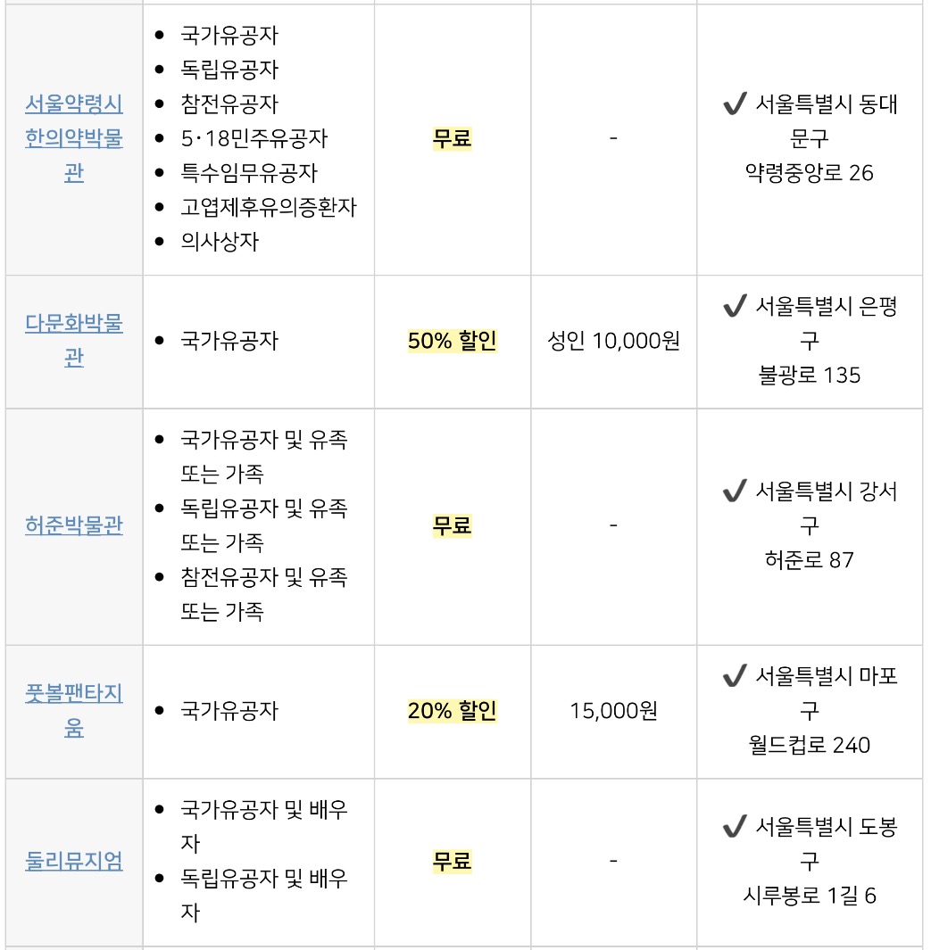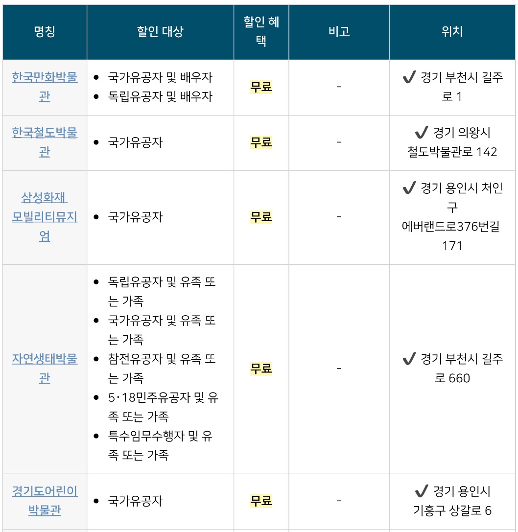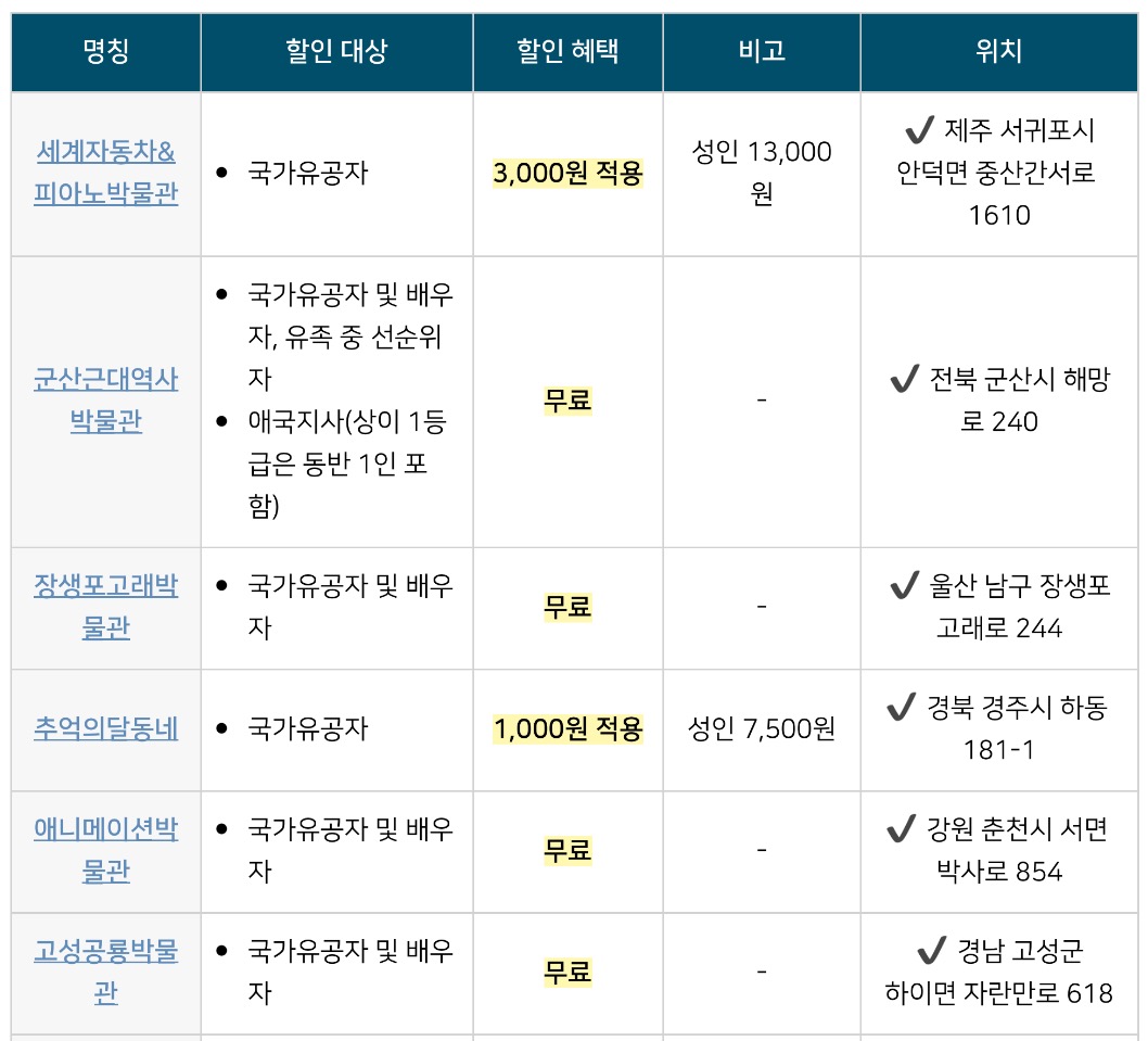 ※ 상기 할인 혜택은 해당 시설 홈페이지 내 예매정보 기 준이며, 각 시설별 상황에 따라 변경될 수 있으니 꼭 예매 전 국가유공자 할인 혜택 적용 여부에 대해 확인 부탁드립니다.