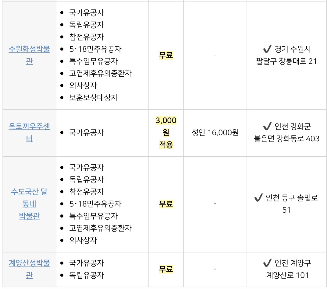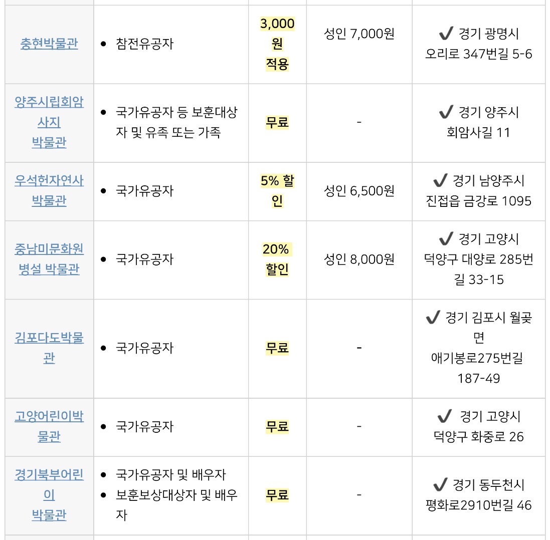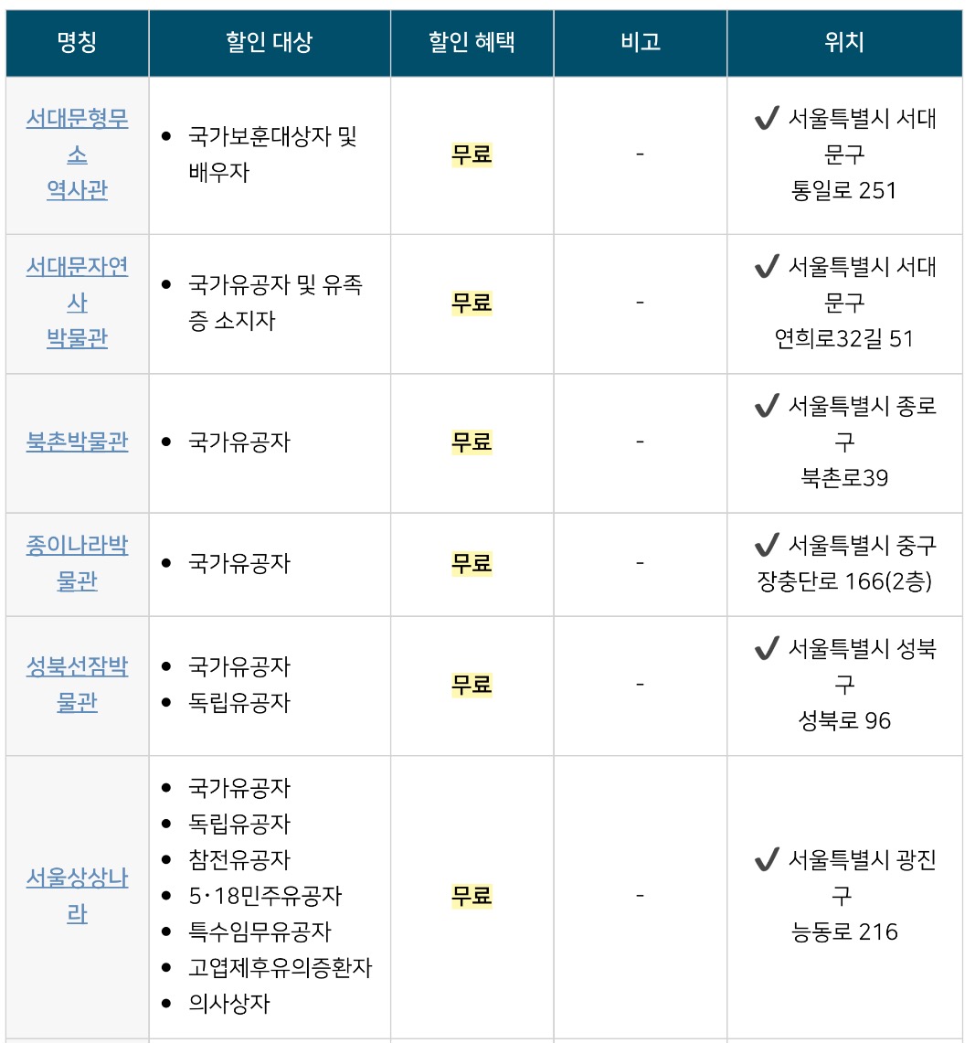 ※ 상기 할인 혜택은 해당 시설 홈페이지 내 예매정보 기 준이며, 각 시설별 상황에 따라 변경될 수 있으니 꼭 예매 전 국가유공자 할인 혜택 적용 여부에 대해 확인 부탁드립니다.