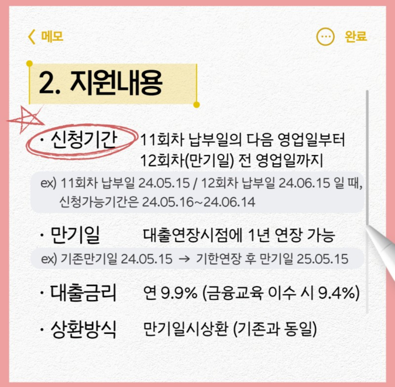 ✅12회 차 납입일(대출 만기일)까지 이자미납 등 자격요건 미충족 시, 기한연장이 불가할 수 있습니다.