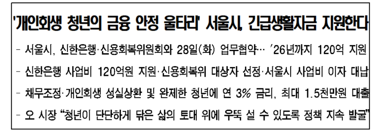 이를 위해 서울시는 2024년 5월 28일(화) 14시 서울시청에서 ㈜신한은행, 신용회복위원회와 업무협약(MOU)을 체결한다고 합니다.