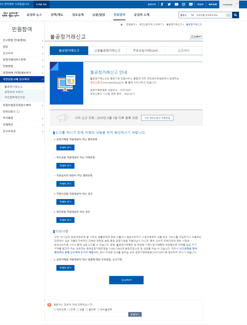 ② 화면 상단메뉴에서 민원 참여 버튼 클릭 > 불공정거래 신고 버튼 클릭 > 개인정보 수집에 동의를 체크 및 본인인증 진행