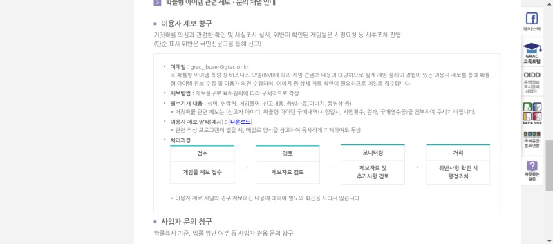 확률형 아이템의 확률정보가 제대로 표시되지 않거나 구매·사용 결과 확률이 표시된 것과 다르게 나오는 것 같은 경우 국민신문고 등을 통해 게임물관리위원회로 신고할 수 있습니다.