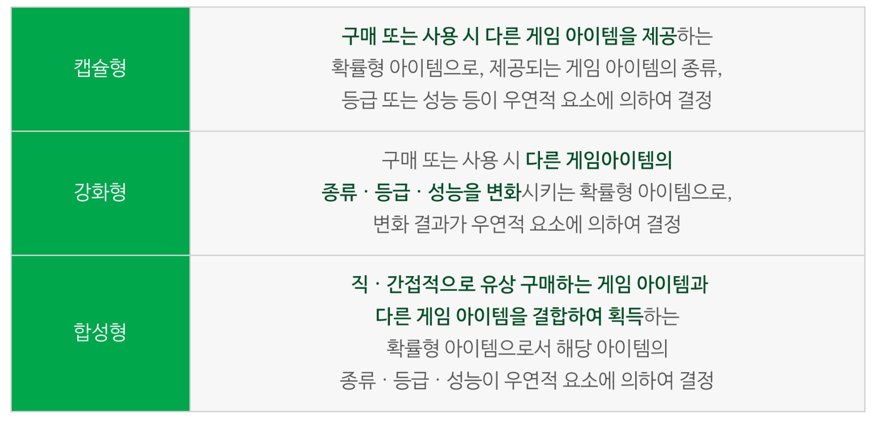 ✔️강화형: 구매 또는 사용 시 다른 게임아이템의 종류ㆍ등급ㆍ성능을 변화시키는 확률형 아이템으로, 변화 결과가 우연적 요소에 의하여 결정