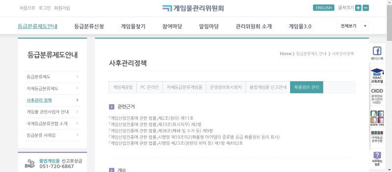 ② 화면 상단 메뉴에서 ‘등급분류제도안내’-‘사후관리정책’클릭