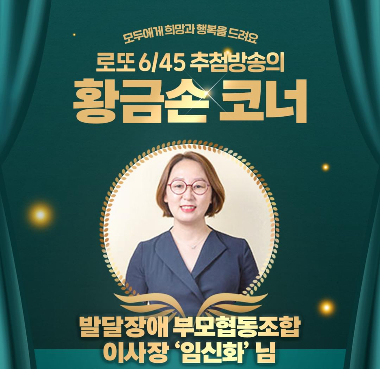 발달장애 아동을 돕는 사회적 협동조합 임신화 이사장이 1122회 MBC ‘생방송 행복드림 로또 6/45’ ‘황금손’으로 출연한다고 합니다.