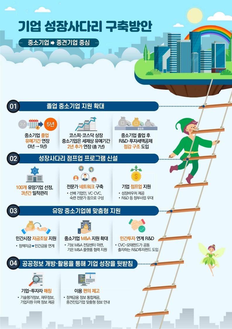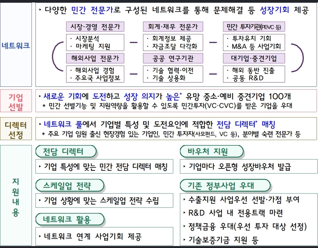 정부는 또 유망 중소기업 100개를 선정해 3년간 지원하는 '성장사다리 점프업 프로그램'(가칭)을 신설한다는데 전직 기업인과 민간 투자기관 등으로 네트워크 풀을 구성하고 전담 디렉터를 지정해 스케일업 전략을 수립할 예정이라고 합니다.