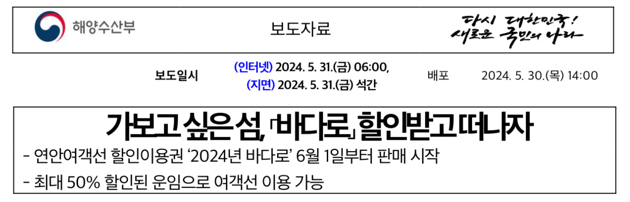 해양수산부는 2024년 6월 1일(토)부터 연안여객선 할인이용권 ‘2024년 바다로’ 판매를 시작한다고 밝혔습니다.
